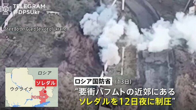 ロシア国防省は、ウクライナ東部の激戦地・ソレダルを制圧したと発表しました。ロシア国防省は13日、ウクライナ東部ドネツク州の要衝バフムト近郊にあるソレダルを12日夜に制圧したと発表しました。バフムトにいる…