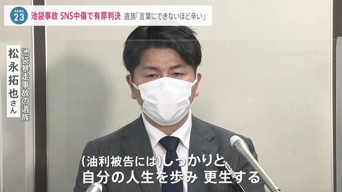 2019年4月に起きた東京・池袋の暴走事故で妻と娘を亡くした松永拓也さんをツイッター上で中傷したなどとして、侮辱罪などの罪に問われた男に東京地裁は13日、有罪判決を言い渡しました。松永さんは判決後「人の命…