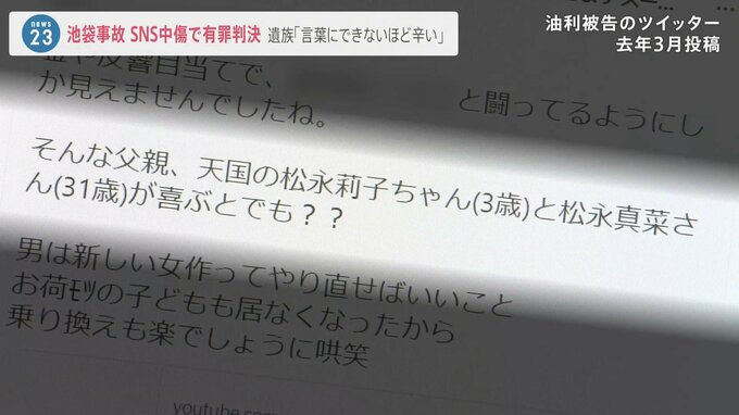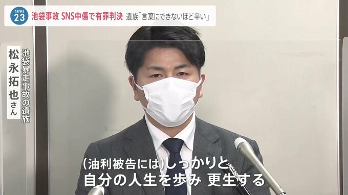 2019年4月に起きた東京・池袋の暴走事故で妻と娘を亡くした松永拓也さんをツイッター上で中傷したなどとして、侮辱罪などの罪に問われた男に東京地裁は13日、有罪判決を言い渡しました。松永さんは判決後「人の命を無駄にしたくない、交通事故をなくしたいという思いでやっていて、言葉にできないほど辛いものだった」などと中傷に対する心情を語りました。