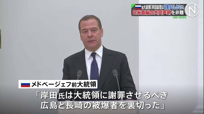 ロシアのメドベージェフ前大統領は、ウクライナでのロシアの核使用は「人類に対する敵対行為」になると警告した日米首脳の共同声明について非難し、岸田総理は「閣議で切腹するしかない」などと強く反発しました。…