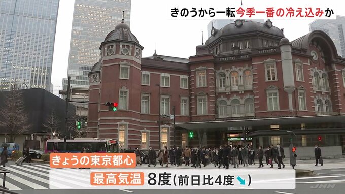 きょうの関東地方は雨で日差しが遮られ、きのうまでとは一転して厳しい寒さとなり、東京では今季一番の冷え込みとなりそうです。けさの東京駅前。冷たい雨がパラパラと降り注ぐ中、コートやマフラーで防寒対策をし…