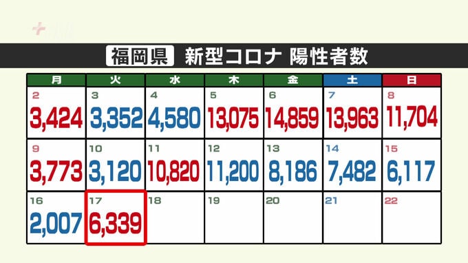 新型コロナウイルスの感染状況です。福岡県は17日、新たに6339人の陽性を発表しました。5日連続で1万人を下回っています。発表自治体別の内訳は、福岡市が1832人、北九州市が1094人、久留米市…