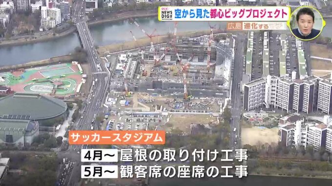 工事は、スタジアム西側部分の鉄骨が最上階の7階まで組み上がりました。4月以降には屋根の取り付け工事。5月以降には観客席の座席の工事が始まる予定です。