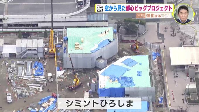 「ここも工事が進んでますね。『ひろしまゲートパークプラザ』と名付けられた広場になるわけですが、その周辺に円を描くように小さな建物の建設が進んでいます。ここは、『シミントひろしま』と呼ばれる商業施設であるとか、物販などのスペースが、低層の建物が数個作られるという形になっています。屋根付きのスペースなどもできる広場が、その中央ということになるわけです」