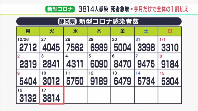 1月17日、静岡県内で新たに3814人が新型コロナウイルスに感染したことが分かりました。1月に入り、静岡県内の死者数が急増し、危機的な状況が続いています。