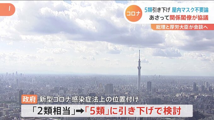 新型コロナウイルス対策の関係閣僚があさって協議を行い、感染症法上の位置づけを「5類」に引き下げる時期などについて議論する見通しであることがわかりました。屋内でのマスク着用不要論も浮上しています。政府…