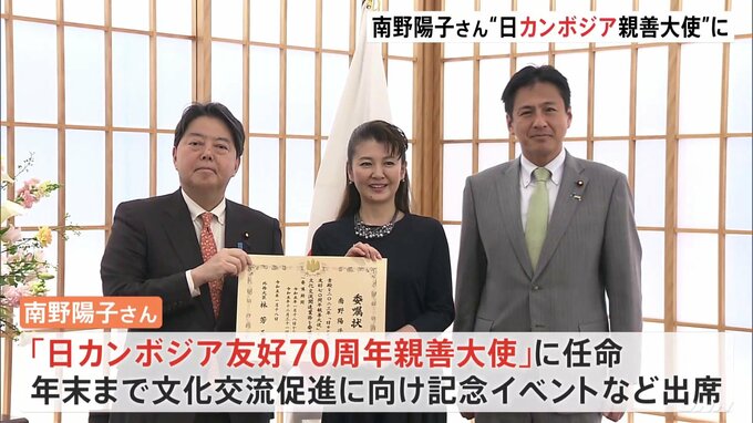 歌手で俳優の南野陽子さんが「日カンボジア友好70周年親善大使」に任命され、きょう外務省で委嘱状を受け取りました。親善大使に任命された南野さんは、テレビ番組の企画をきっかけにカンボジアの孤児院を訪れるな…