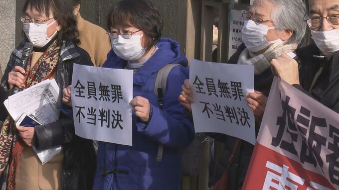 判決を前に、裁判所前には原告団の関係者が集まり、一審の判決を取り消し、旧経営陣の有罪判決を求めました。