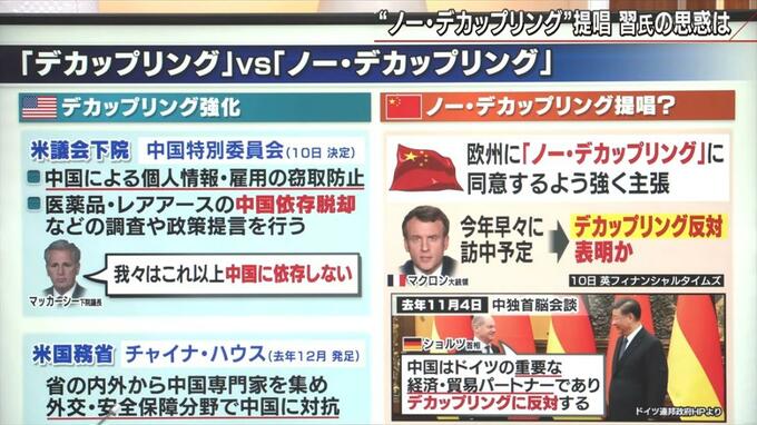 一方、中国はヨーロッパに対し「ノー・デカップリング」に同意するよう主張している。フランス・マクロン大統領は今年早々にも訪中しデカップリングに反対を表明するのではないかと、イギリス・フィナンシャルタイムズは伝えている。またドイツは去年既にショルツ首相が「中国は重要な経済・貿易パートナー」とし、デカップリング反対を明言している。