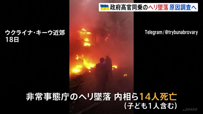 ウクライナの首都・キーウ近郊で、政府高官らを乗せたヘリが墜落しましたが、現地当局は故障や破壊工作などの可能性も含め調べる方針です。18日、キーウ近郊で非常事態庁のヘリが墜落。乗っていた内相ら子ども1人…