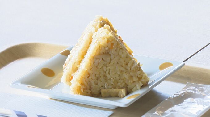 ミカンジュースで炊いたご飯で作る“みかんおにぎり”。
