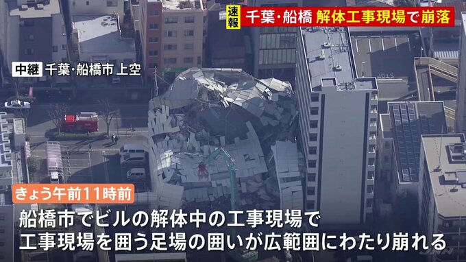 千葉県船橋市の工事現場で囲いが崩れる事故がありました。きょう午前11時前、千葉県船橋市でビルの解体中の工事現場で、工事現場を囲っていた足場の囲いが広範囲にわたり崩れました。消防によりますと、「倒壊した…