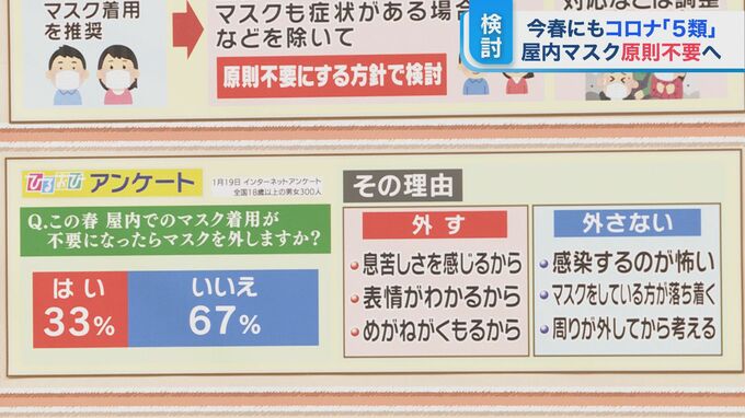 政府はこの春にも、新型コロナを季節性インフルエンザと同じ「5類」に引き下げる方針です。また、「屋内でのマスク着用」についても原則不要とする案が出ています。