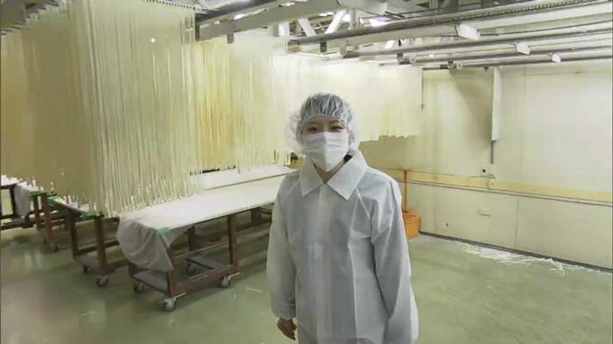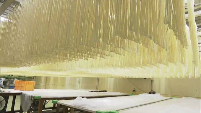 (谷口笑子キャスター リポート)「手延べ製法でつくられたうどんが、ずらりと並んでいます。今でも伝統的な製法でつくられているということです」