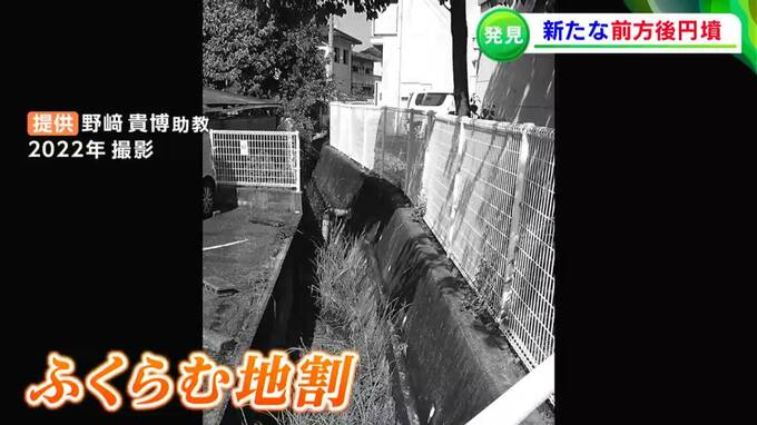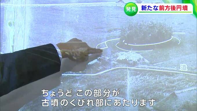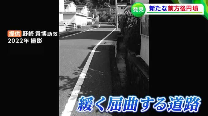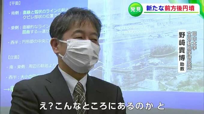 (岡山大学文明動態学研究所 野崎貴博助教)「ちょうどここが古墳のくびれ部にあたります。ですから、こういうカーブを描く地割については、前方後円墳の可能性が非常に高い」