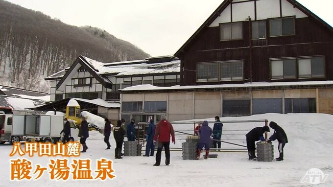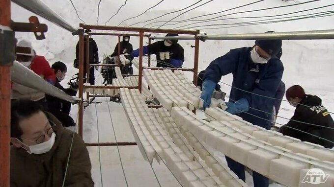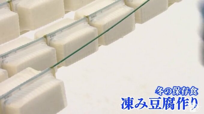 八甲田山麓にある青森市の酸ヶ湯温泉で厳しい寒さをいかして半世紀以上前から作られているのが冬場の保存食、凍み豆腐です。20日は従業員10人が屋外に設置したワイヤーに豆腐2000丁を吊り下げました。