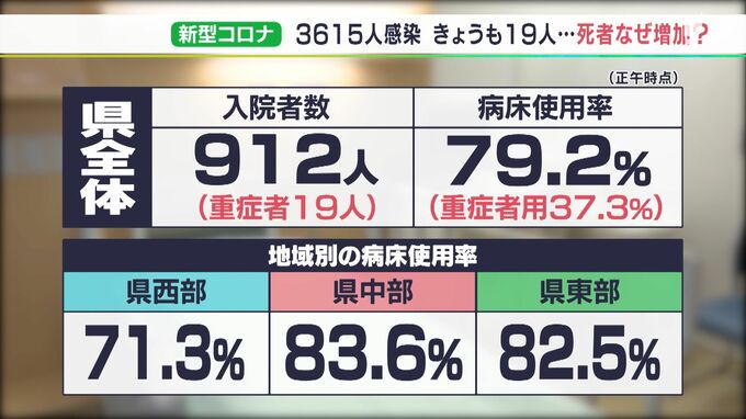 病床のひっ迫も解消のめどが立っていません。静岡県中部と東部では、8割を超え、県全体で79.2%となっています。ここにきて、深刻さを増しているのが死者数の増加です。
