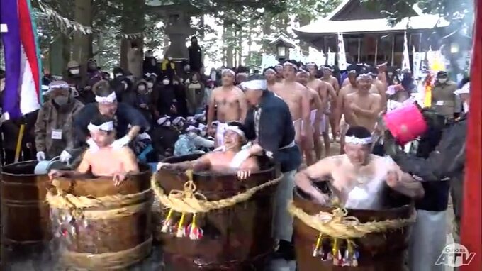 青森県弘前市の鬼沢地区で旧正月の伝統行事「裸参り」が22日、3年ぶりに行われ厳しい寒さの中、下帯姿の男たちが冷水が入った大きな樽に飛び込み「水垢離(みずごり)」をとって心と体を清めました。弘前市の鬼神…