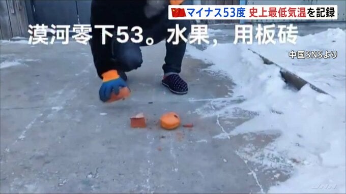 今回の強烈な寒波は、一足先に中国東北部にも影響を与えています。中国最北端の街ではマイナス53度を記録、史上最低気温を更新しました。こちらは、中国最北端の街、黒竜江省・漠河市で撮影されたとみられる映像で…