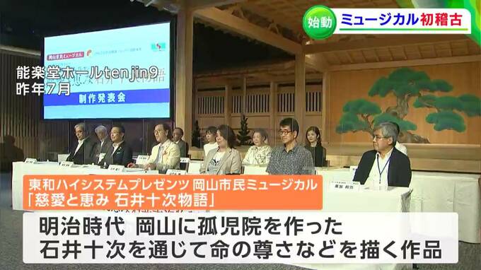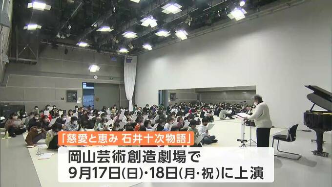 岡山市民ミュージカル「慈愛と恵み 石井十次物語」は、明治時代、岡山に孤児院をつくった石井十次の生涯を通じて、命の尊さや人の愛などを描く作品です。