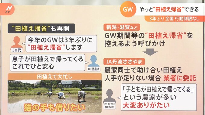 米農家の方にとってゴールデンウィークという期間は、例年「田植えで大忙し」で猫の手も借りたい。とにかく、手間がかかるし人手が必要な期間なんだそうです。ただ新型コロナウイルスの影響もあった、一昨年、去年というのは、新潟県や滋賀県ではゴールデンウィークの期間等の“田植え帰省”を控えるような呼びかけもありました。