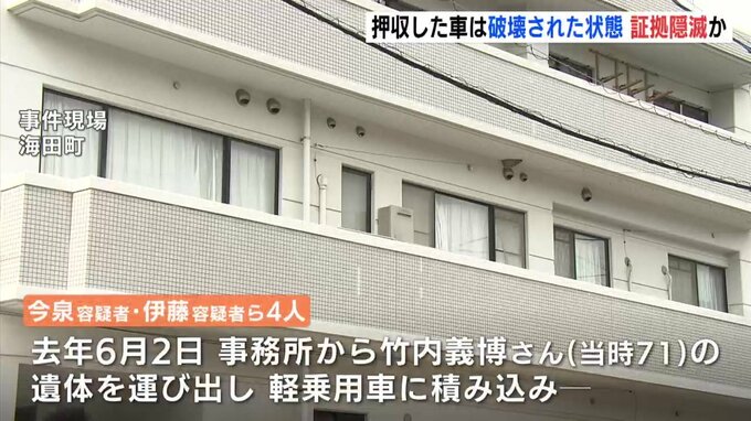 警察によりますと、住所不定の 今泉俊太 容疑者(32)、伊藤圭亮 容疑者(28)など男女4人は共謀し、去年6月2日、海田町の事務所から 竹内義博 さん(当時71)の遺体を運び出して軽乗用車に積み込み、翌日までの間に埼玉県かその周辺まで運搬したうえ、遺棄した疑いがもたれています。