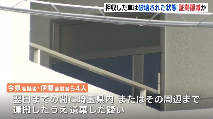 警察は、去年6月、事件に使われたとみられる軽乗用車を埼玉県内で発見、押収しています。捜査関係者によりますと、高速道路のサービスエリアの防犯カメラに男2人の姿が映っていたということで、警察は遺体を車で運搬したのは、今泉容疑者と伊藤容疑者の2人とみています。