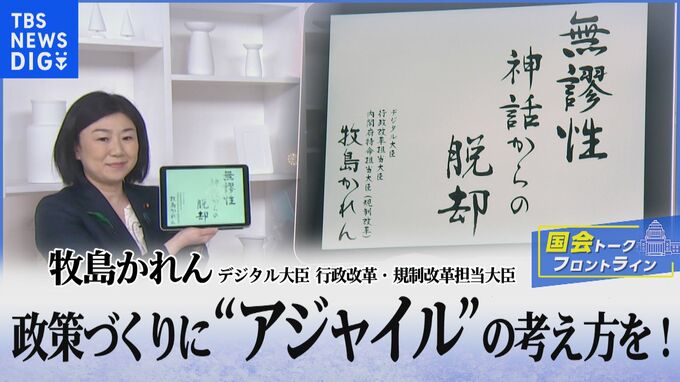 番組出演ゲストに毎回お願いしている揮毫(きごう)、「今週の一筆」。おもむろにタブレットを取り出して「無謬(むびゅう)性神話からの脱却」と答えたのは今回のゲスト、牧島かれんデジタル・行革・規制改革担当…