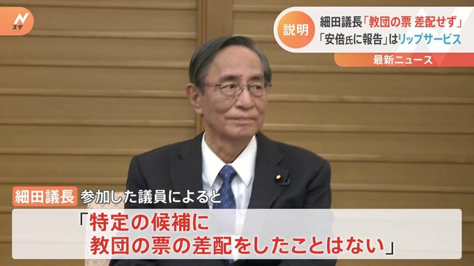 旧統一教会との接点が指摘されている衆議院の細田議長が非公開の場で、与野党の代表者からの質疑に応じ、選挙で「教団の票を差配したことはない」と述べました。細田議長は24日午後、議長公邸でおよそ1時間、与野…