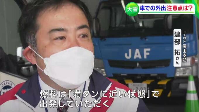 (JAF岡山支部 建部拓さん)「燃料は満タンに近い状態で出発していただく。燃料がなくなってエンジンが止まると、車内を暖めることもできなくなりますので」