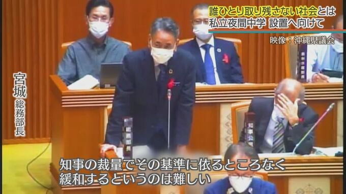 玉城知事(答弁)「本県においても夜間中学校を設置する必要性は議員同様に認識しているところであります。今後中学校設置基準の緩和について、しっかり国に働きかけて参りたい」