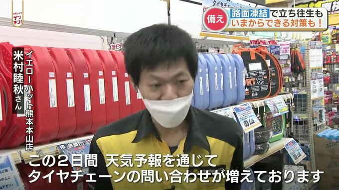 イエローハット 熊本本山店 米村 睦秋さん「この2日間、天気予報を通じてタイヤチェーンの問い合わせが増えております」