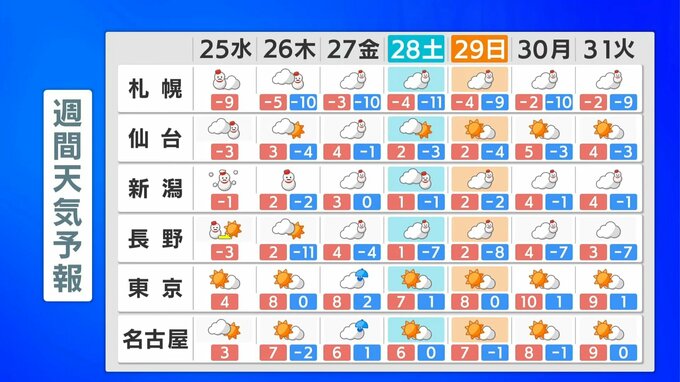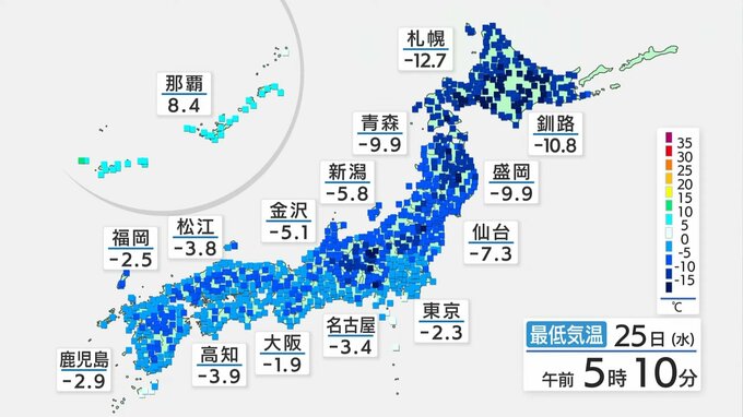 午前5時10分までの最低気温は、沖縄・那覇以外で各地、氷点下の冷え込みとなっています。東京はマイナス2.3度、名古屋はマイナス3.4度など、今シーズン一番の冷え込みとなっています。市街地でも水道管が凍結するような寒さとなっています。