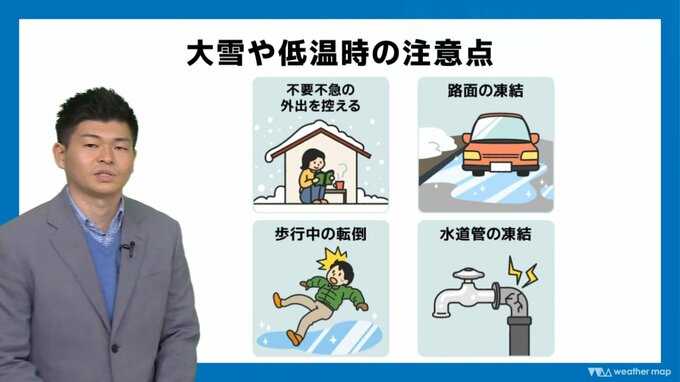 日本海側の皆さんを中心に不要不急の外出は控えるようにしてください。やむを得ず外出する場合、路面の凍結、歩行時の転倒にくれぐれもお気をつけください。そして、水道管が凍結しているおそれがあります。その場合、熱湯をかけるのではなく、ぬるま湯をゆっくりかけるようにしてください。