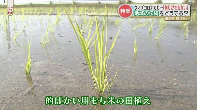 的ばかいに先立って行われる田植え。柔らかく長い茎のもち米が「的」の材料に最適で、町内の農家が祭りのために作っています。