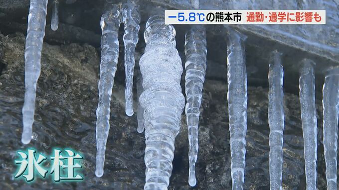一方、最低気温が氷点下5.8度を記録し5年ぶりに氷点下5度を下回った熊本市。市役所前の水のオブジェに氷柱ができ、石やライトも氷で覆われました。