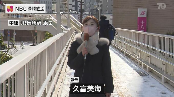 JR長崎駅前から久富美海アナウンサーが中継。25日正午前。気象台によると、長崎県では大雪のおそれはなくなったものの26日にかけて気温が平年よりかなり低くなり、10年に一度程度の低温となる見込み。引き続き積雪…