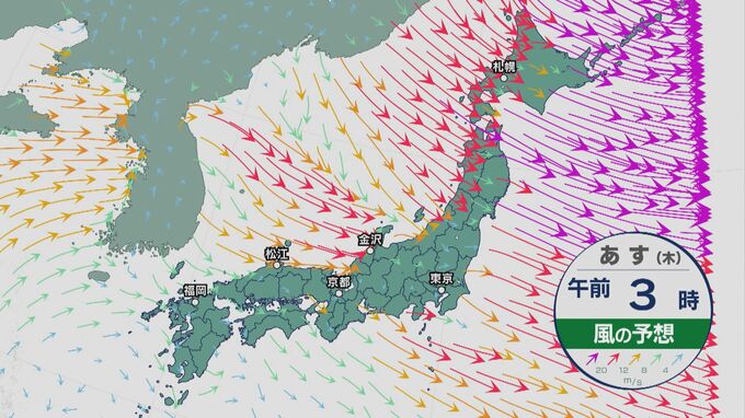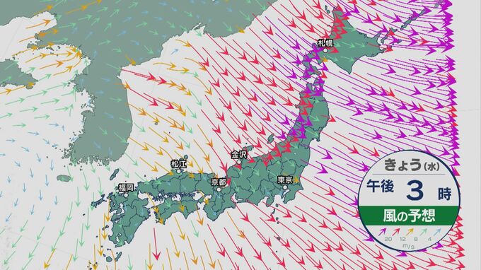 そして風にも警戒が必要です。東日本や北日本の日本海側では最大瞬間風速が35mと台風並みの風が吹き荒れそうです。これに雪が加わりますから、吹雪いて視界がかなり悪くなりそうです。車の運転や登下校時は十分お気をつけください。