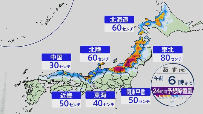 明日にかけて予想される雪の降る量ですが、いずれも多いところで東北地方で80センチ、北海道北陸地方で60センチ、関東甲信と近畿北部で50センチ、東海地方で40センチ、中国地方主に山陰地方で30センチとなっています。