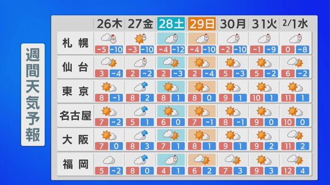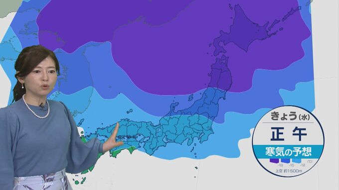 そして、強い寒気の影響で日中もほとんど気温が上がりません。北日本では日中でも氷点下です。関東から西の地方でも5℃以下のところがほとんど。東京や大阪では4℃、福岡は2℃と1年で一番寒い時期を下回りそうです。