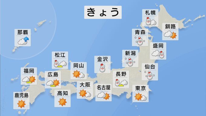 今日これからの予報マークで見てみましょう。今日は日本海側だけではなくて、盛岡や仙台など太平洋側の地方も雪で積もりそうです。日本海側では風も強く吹いて荒れた天気が続くでしょう。一方で、関東から西の太平洋側と九州では晴れそうです。