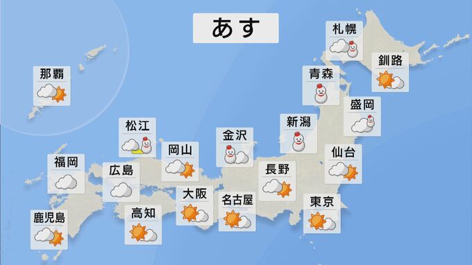 明日の予報です。日本海側の地方の雪が続きますが、今日に比べて風は少しおさまってきそうです。仙台から西の太平洋側では、明日は晴れるところが多いでしょう。