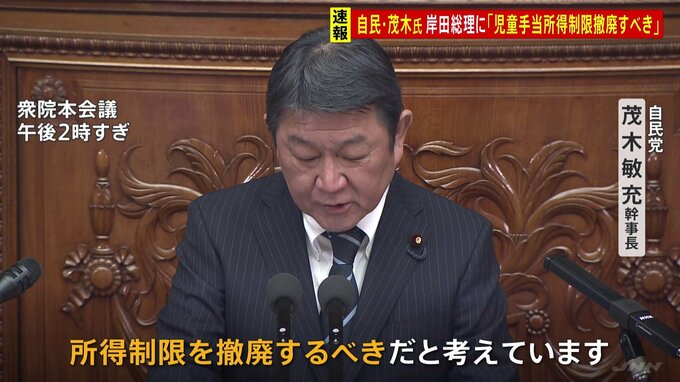 自民党の茂木幹事長は、衆議院の本会議で少子化対策の一環である児童手当について所得制限を撤廃すべきと述べました。自民党 茂木敏充幹事長「児童手当については『すべての子どもの育ちを支える』という観点から…