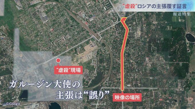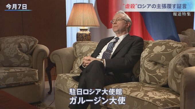 駐日ロシア大使のガルージン氏は、私達の取材に対し、ウクライナ軍がブチャに入った直後に撮影した映像を示し、この映像に遺体が写っていないため「虐殺はウクライナ軍によるフェイク」だと主張している。