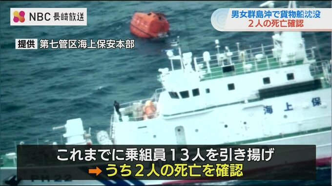 海上保安庁や海上自衛隊民間の船などが救助にあたっていて、これまでに13人の乗組員が引き揚げられ、2人の死亡が確認されたということです。
