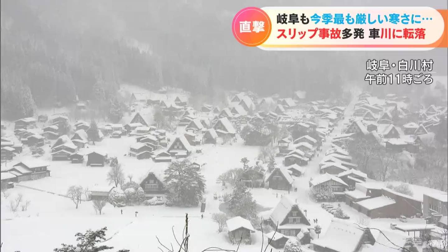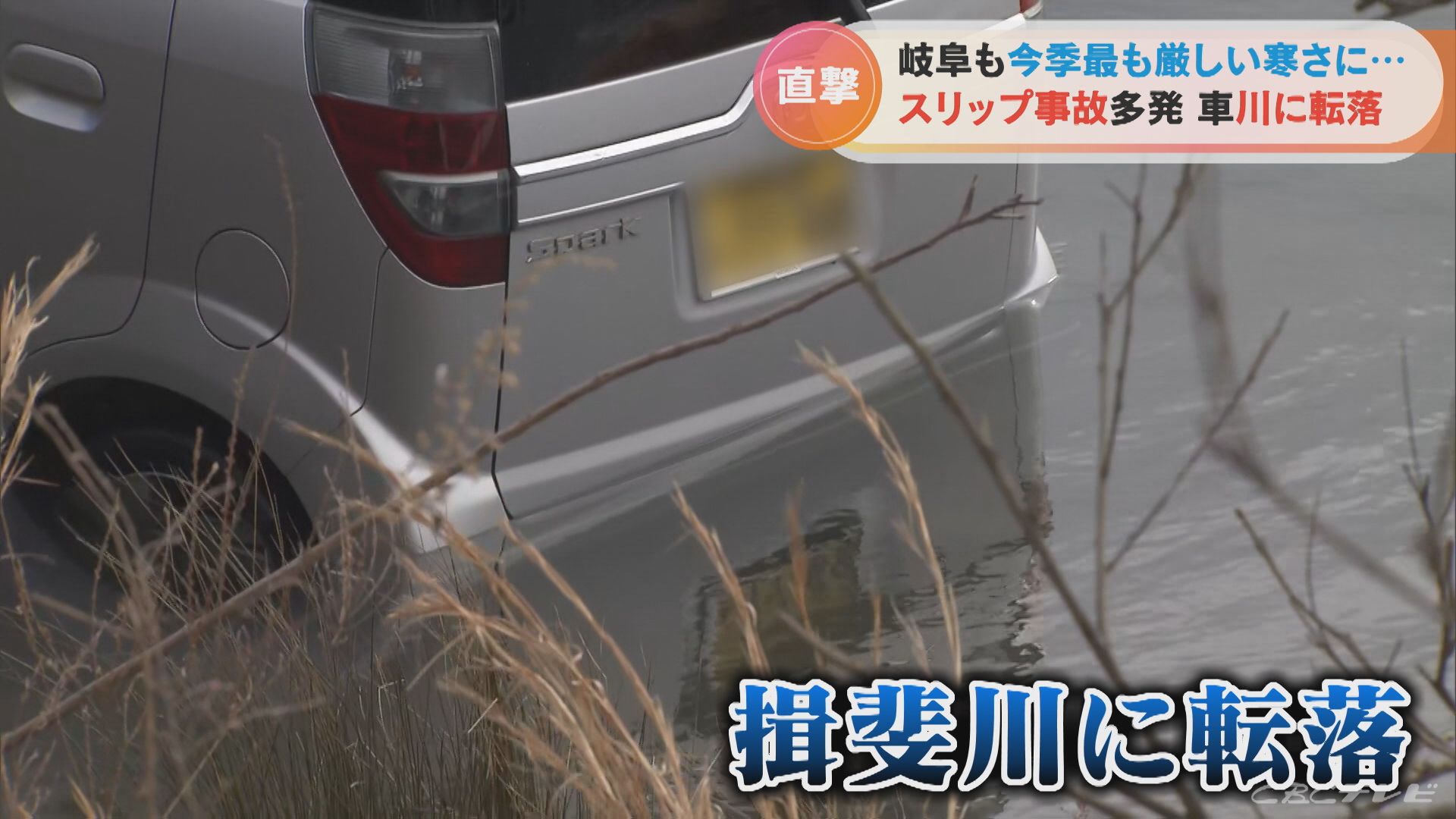 路面があちこちで凍結し危険な状態に。岐阜県海津市の堤防道路では車がスリップし、揖斐川に転落する事故が…