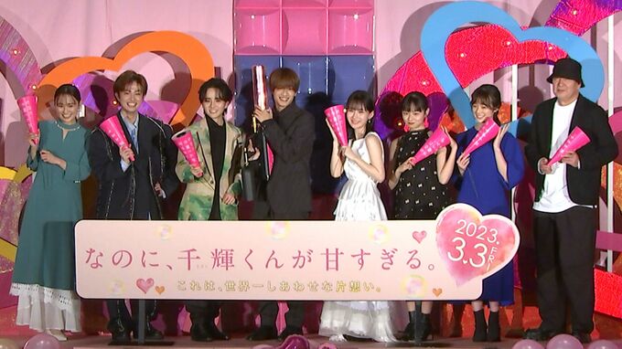 映画「なのに、千輝くんが甘すぎる。」の完成披露試写会が行われ、なにわ男子の高橋恭平さん、畑芽育さん、板垣李光人さん、莉子さん、曽田陵介さん、中島瑠菜さんらが登壇しました。本作は、人生初の告白に玉砕し落ち込んでいる女子高生に、学校一のイケメン千輝くんが「片想いごっこ」を持ちかけ、2人の「片想いごっこ」の行方を描いた胸キュンラブストーリーです。