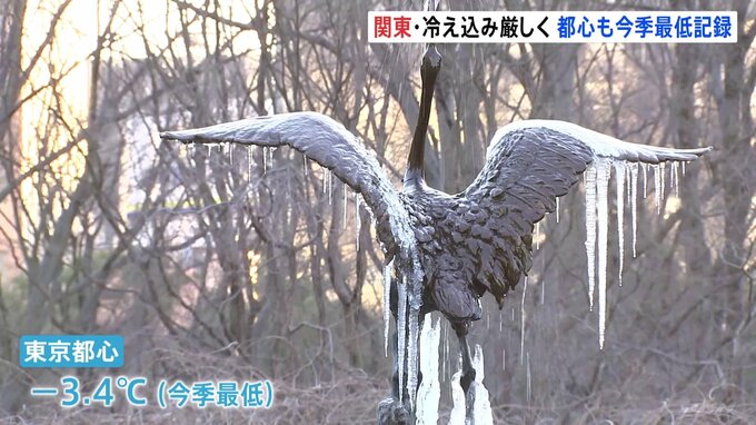 関東地方でも、きのうよりさらに厳しい冷え込みになった場所が多く、けさ東京都心では、今シーズン最低のマイナス3.4度を観測しました。皇居ランナー「(お堀に)氷が張るのが、この様に張ったの見たことないです…
