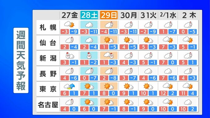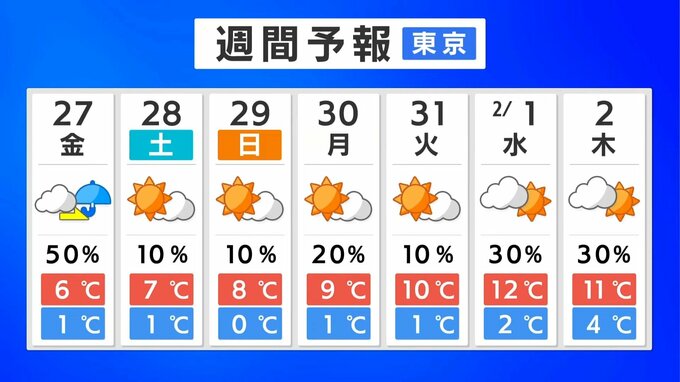 最後に東京の週間予報です。東京はあすは早ければ昼頃から雨が降り出します。降水量次第では夕方以降、雪に変わる見込みです。