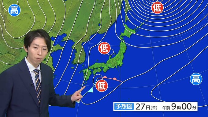 あすの予想天気図です。あすは今度は太平洋側でも天気が崩れます。この南岸低気圧が本州の南海上を進みます。比較的強い寒気が残ったまま低気圧が進むということで、太平洋側であすは雨、または雪の降るところもありそうです。関東も雪の可能性があります。